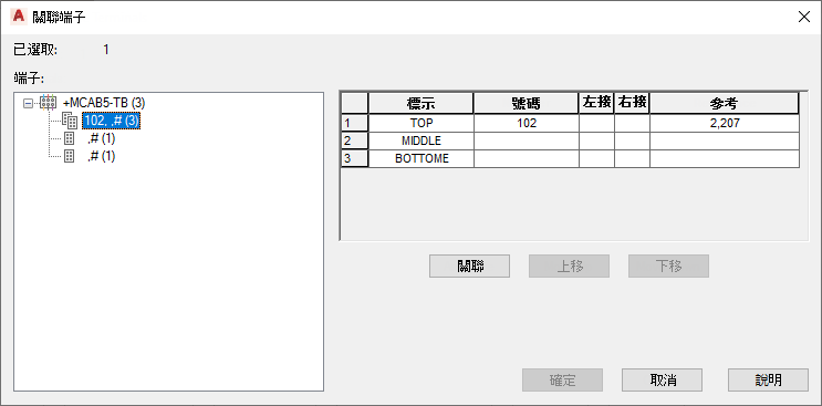 - 「目錄代碼指定」頁籤:除了可在「端子排」頁籤中執行的作業外,您還可以指定、刪除、複製目錄零件號碼或將其貼上至端子台。