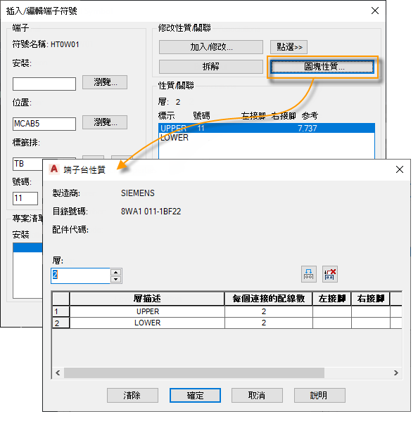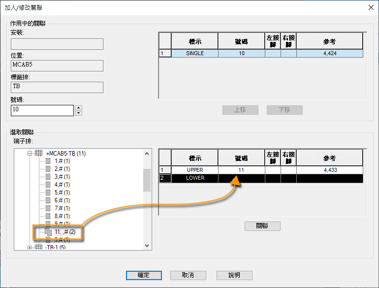 如果端子不在同一圖面中,可編輯您想與其他端子關聯的端子。選取「加入/修改」按鈕可開啟「加入/修改關聯」對話方塊。從該對話方塊中,您可以將端子插入到其他端子上的開放層。