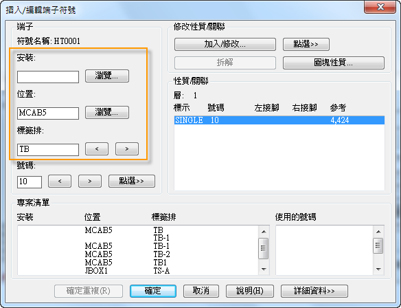 使用「安裝」、「位置」和「標籤排」性質,可將端子一起群組到同一端子排中。