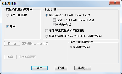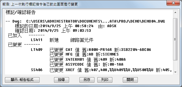 此指令可以追蹤變更,包括不在 AutoCAD Electrical 工具集 中所做的變更。使用「標記」選項建立一個起點。AutoCAD Electrical 工具集 會在每個圖面和元件中加入一些不可見的智慧。