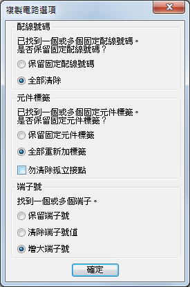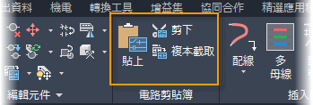 「複本截取」或「剪下」指令會將元件和配線放在「電路剪貼簿」上。使用「貼上」指令可將物件放置在作用中的圖面或其他圖面上。您可能需要更新端子號,因為此指令不允許您增加端子號。