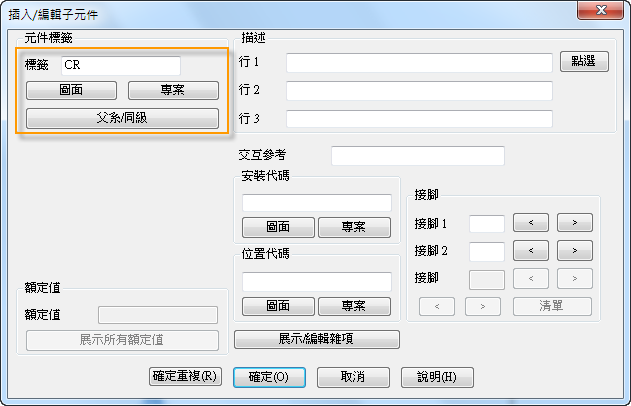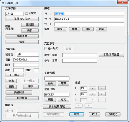 每個符號可擁有一個主目錄值和許多 AutoCAD Electrical 工具集 稱為「多個目錄」的值。編輯元件以加入、編輯或移除目錄指定。