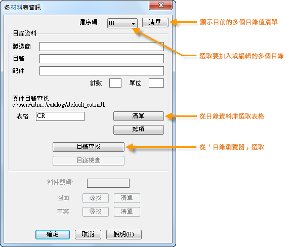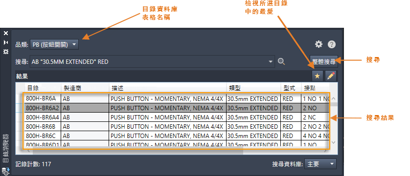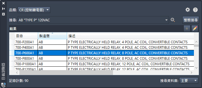 如果您擁有專案的元件清單,並已知道零件號碼,則可從目錄資料庫中選取以插入元件。使用「目錄瀏覽器」選項板,從目錄資料庫插入元件。 查找