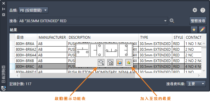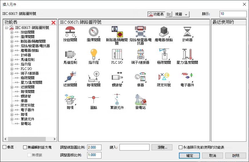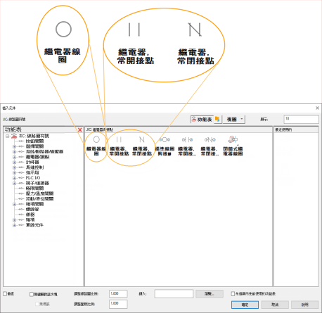 圖示功能表可讓您選取符號類型來插入符號,例如常開按鈕或三段選擇開關。插入符號後,您可以使用描述、目錄資訊等進行註解。