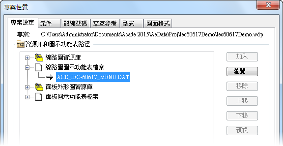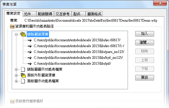 使用「專案性質」對話方塊上的「專案設定」頁籤,可定義您要用於特定專案的資源庫符號集的路徑。