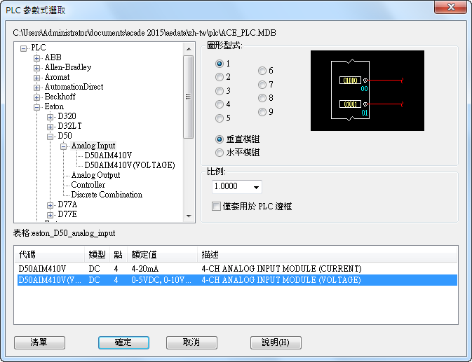 展開製造商、系列和類型,以尋找 PLC 模組。選取 PLC 型式 (如果與圖面預設不同)。選取模組,然後按一下「確定」。使用模組外框選取插入點以協助放置。回答提示 (可能包括機架、插槽、第一個位址等)。