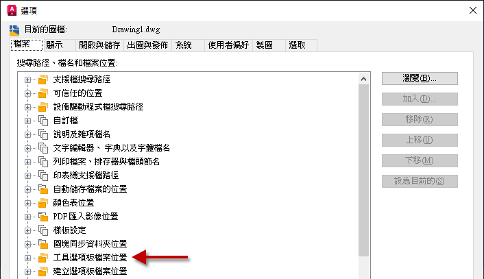 工具選項板檔案包含標準和使用者定義的工具。檔案會儲存在「工具選項板檔案位置」設定所指定的位置。