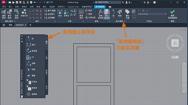 此時會開啟「圖塊編輯器」環境,並且顯示「圖塊編輯器」功能區頁籤。