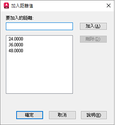 - 在「加入距離值」對話方塊中加入 24 和 48,然後按一下「確定」。36 會自動加入,因為這是線性參數的長度。