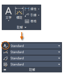 和許多其他註解功能一樣,多行文字也提供大量的設定。在使用 STYLE 指令將這些設定儲存成文字型式之後,您便可以按一下「註解」面板上的下拉式箭頭,存取已儲存的文字型式。目前的文字型式已顯示在下拉式清單的頂端。