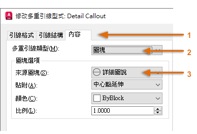 例如,若要建立「詳圖圖說」型式,請啟動 MLEADERSTYLE 指令。在「多重引線型式管理員」中,按一下「新建」,然後選擇新多重引線型式的描述性名稱。按一下「內容」頁籤,選擇「圖塊」,然後選取所示的「詳圖圖說」。
