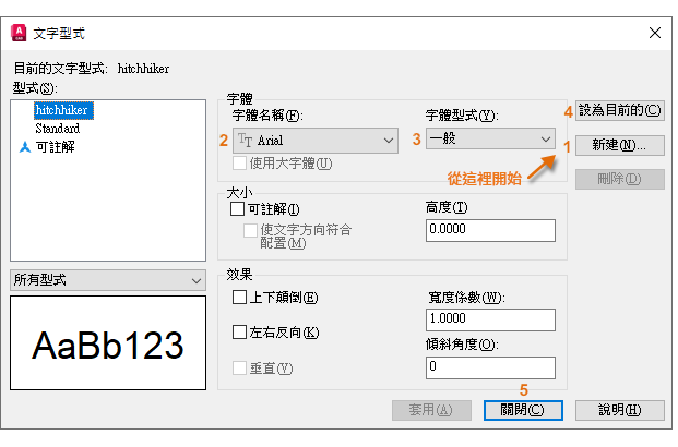 提示: 將任何新的或變更的文字型式儲存在圖面樣板檔。然後您就可以在新圖面上直接使用以節省大量的時間。