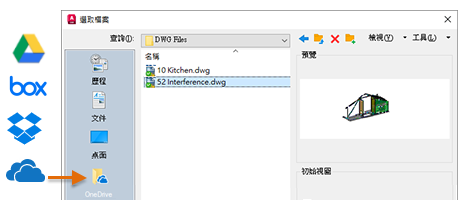如果您有雲端儲存服務提供者的帳戶,可以將其新增到 AutoCAD 檔案選取對話方塊中的「位置」列,直接導覽至您的雲端儲存服務帳戶中的圖面。只需在「位置」列內按一下右鍵,然後輸入導覽捷徑的名稱和路徑即可。