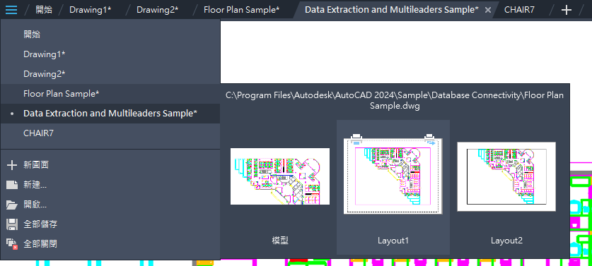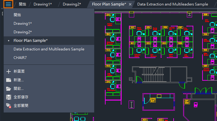 使用新的檔案頁籤功能表可在圖面之間切換、建立或開啟圖面、儲存所有圖面、關閉所有圖面等。