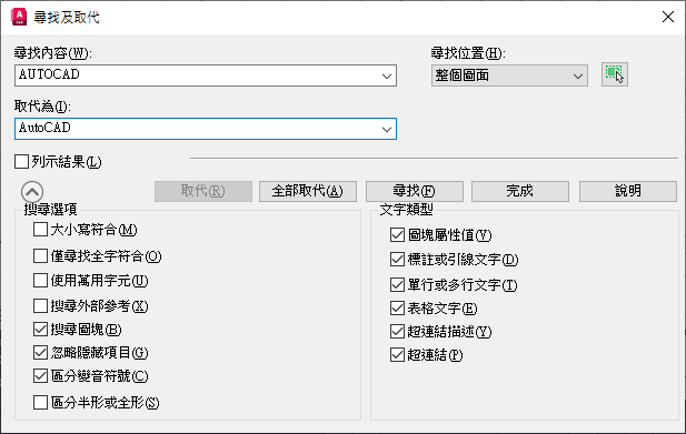 「尋找範圍」設定用於控制是在整個圖面中尋找及取代文字,還是在目前選取的物件中尋找及取代文字。