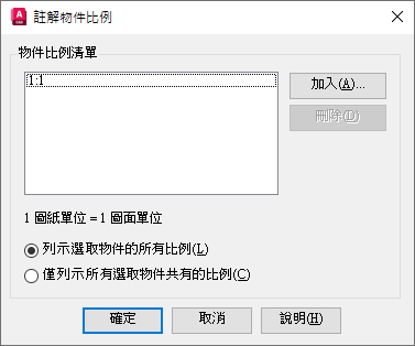 指定所選物件支援的所有比例顯示在「物件比例清單」中。
