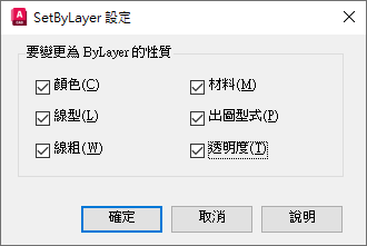 將所選物件與已解鎖圖層上插入的圖塊的顏色、線型、線粗、材料、出圖型式和透明度性質取代變更為「依圖層」。
