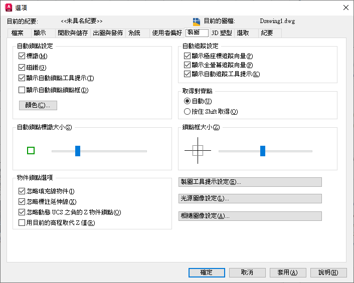 為多項編輯特徵 (包括自動鎖點和自動追蹤功能) 設定選項。