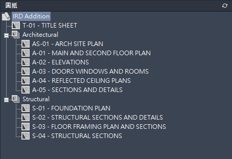 - 圖紙子集通常與某種訓練 (如建築或機械設計) 相關聯。例如,在建築上,您可以使用名為「結構」的子集;在機械設計上,可以使用名為「標準扣件」的子集。在某些情況下,您也可能會發現建立與審閱或完成狀態相關聯的子集很有用。您可以依需要將子集以巢狀方式放置在其它子集中。建立或匯入圖紙或子集後,您可以在樹狀檢視中拖曳,對其重新排序。