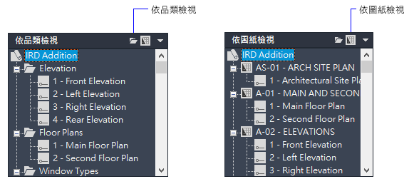 在「圖紙清單」頁籤上,可以將圖紙排列到子集集合中。在「圖紙視圖」頁籤上,可以將視圖排列到品類集合中。
