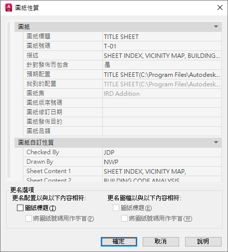 顯示所選圖紙所特有的資訊,例如,圖紙標題、圖紙號碼,以及是否包括在發佈作業中。還顯示自訂性質 (如果有)。