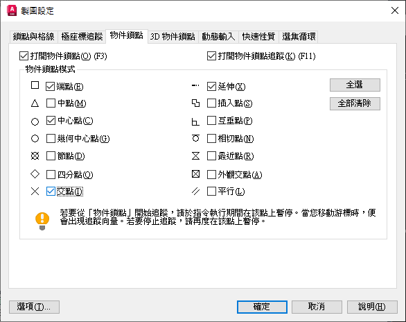 在指令中指定點時,物件鎖點追蹤可使游標根據目前物件的鎖點模式沿著對齊路徑追蹤。(系統變數 AUTOSNAP)
