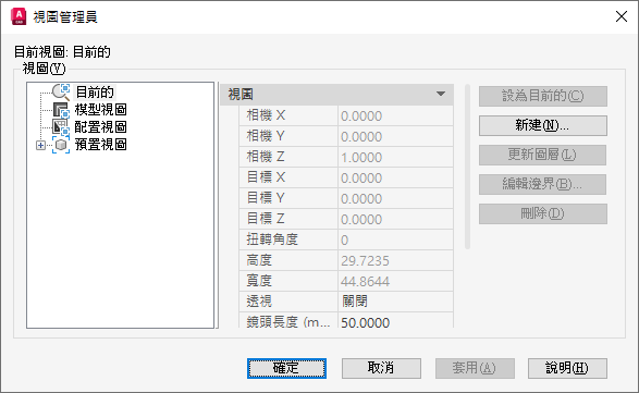 顯示「新視圖/快照性質」對話方塊或「新視圖」對話方塊。