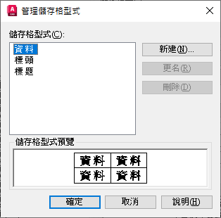 顯示目前表格型式中的所有儲存格型式,並可讓您建立和刪除儲存格型式。
