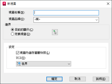 暫時關閉「新視圖」和「視圖管理員」對話方塊,以便您使用指向設備定義「新視圖」視窗的對角點。