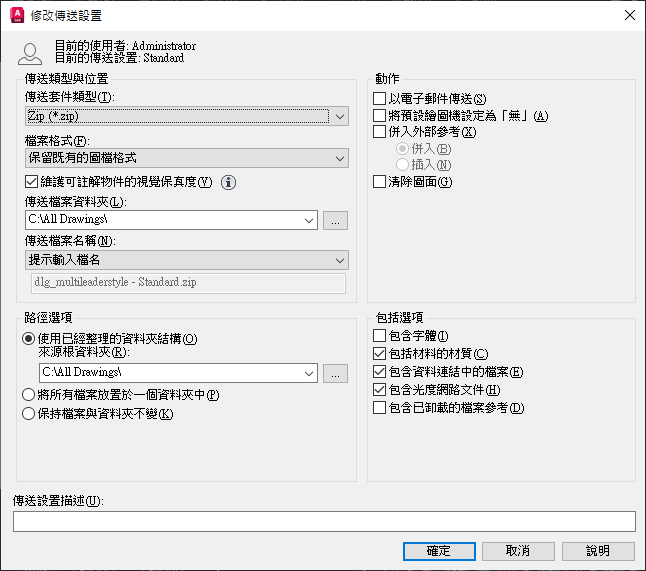 傳送圖紙集時,來源根資料夾也包含圖紙資料 (DST) 檔。(不適用於 AutoCAD LT)。