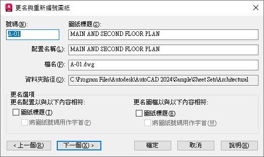 將下一張圖紙載入該對話方塊。這樣會提供一種為一系列圖紙重新編號或重新建立標題的簡便方法。*