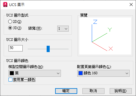 控制在模型空間視埠及配置頁籤中 UCS 圖示的顏色。