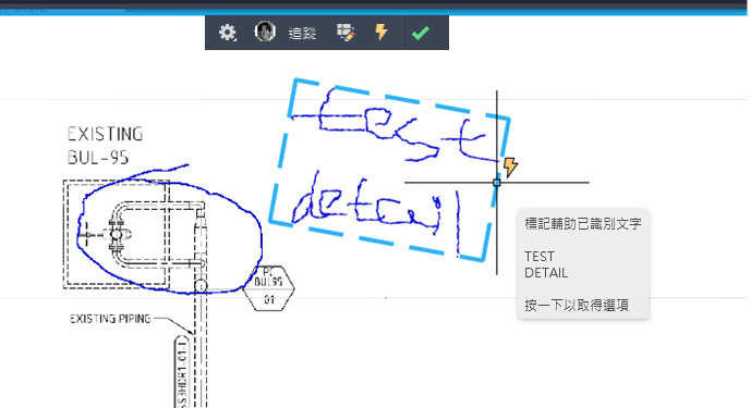 「標記輔助」會自動將標記識別為文字、引線和修訂雲形。按一下識別的標記,然後插入為多行文字、多重引線或修訂雲形物件。您可以在插入文字之前對其進行編輯,或選擇將文字複製到剪貼簿。