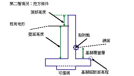 貼附點根據擋土牆處於挖方情況還是填方條件而有所不同。如果其在填方中,則貼附點將位於擋土牆頂部附近。如果其在挖方中,則貼附點將位於基腳附近。