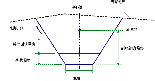 溝渠底部的高程是從縱坡線高程減去「到底部的偏移」值而計算得出的。將圍繞該高程處的貼附點偏移對稱放置水平溝渠底部連接,並且將側坡向上延伸到既有地形。將在溝渠底部上方指定深度處放置水平基礎連接。將在基礎連接上方指定深度處放置水平特殊回填連接。
