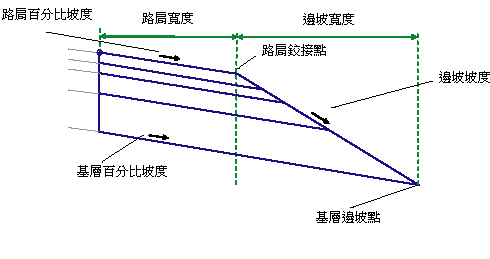 | 基層邊坡類型 | 選取是保持邊坡連接具有固定坡度和可變寬度,還是保持其具有固定寬度和可變坡度 | 選取清單:a)「保留坡度,調整寬度」、b)「保留寬度,調整坡度」 | 保留坡度,調整寬度 |