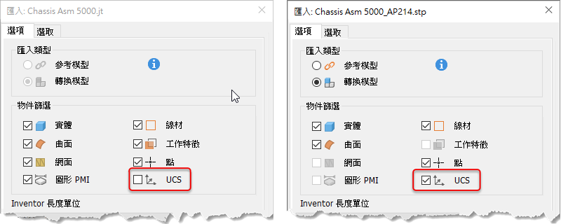 JT 和 STEP 均支援在匯入時包括 UCS 的選項。