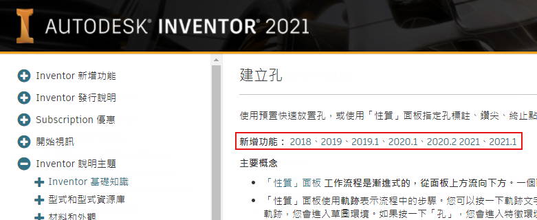 此外,使用 F1 取得說明頁面時 (如果適用),您將在頁面頂端看到連至〈新增功能〉主題的連結,該主題說明了特徵或指令發生的變更。