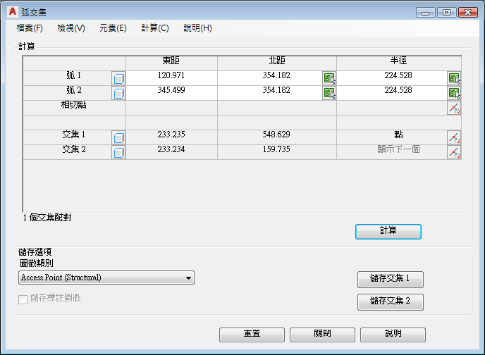 以下「弧的交點」對話方塊會展示「建構和計算指令」的對話方塊控制和元件。