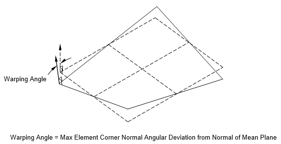 Skew angle for a quadrilateral element or solid element face is a measure of how much of a parallelogram it is relative to a rectangle. It is defined to be the angle between the lines that join midpoints of the opposite sides of the quadrilateral minus 90 degrees. A rectangle would have a zero skew angle. Skew angle for a triangular element or solid element face is a measure of how close it is in shape relative to an equilateral triangle. Skew angle for the triangular element is defined to be the angle between the lines that join midpoints of two opposite sides relative to the line through their vertex and the midpoint of the remaining side minus 90 degrees. An equilateral triangle would have a zero skew angle. Each vertex of the triangle is examined and the largest skew angle reported. Element accuracy can be sensitive to element skew angle.