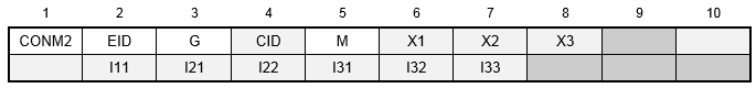 | X1, X2, X3 | Offset distances from the grid point to the center of gravity of the mass in the coordinate system defined in field 4, unless CID = -1, in which case X1, X2, X3 are the coordinates of the center of gravity of the mass in the basic coordinate system. | Real or blank | 0.0 |