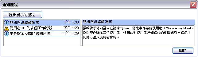 當您關閉Worksharing Monitor時,便會捨棄「通知」歷程。