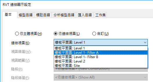 - 對於「連結視圖」,選取您要將連結模型中哪個視圖的顯示設定用於目前主體視圖中的連結模型。