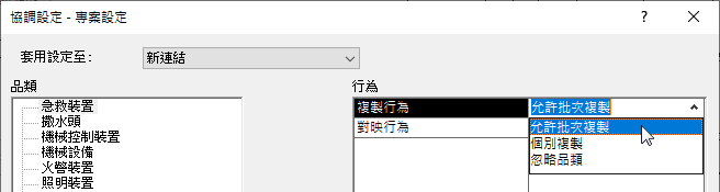 在從連結模型複製裝置到 MEP 模型的當下或之前,可以在「指定協調設定」對話方塊中指定每個裝置品類的複製行為。