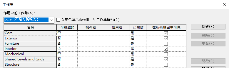 建立工作集時,可以使用「新工作集」對話方塊中的「在所有視圖中可見」選項,指出該工作集是否要顯示在模型的所有視圖中。此設定會反映在「工作集」對話方塊的「在所有視圖中可見」欄中。