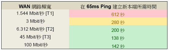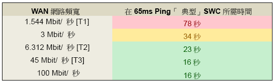 請注意,我們所報告「WAN 網路頻寬」反映網路的實際流量,並非連線等級。外部因素 (例如不相關的串流流量) 可以減少真實世界的可用頻寬,因此我們建議您於典型使用週期期間驗證網路行為。這可透過測量將幾百的 MB 的資料從網路上某一點複製至另一點所需的時間輕鬆達成。(請注意,這必須小心執行,以確保網路壓縮和封包外形不會影響作業的效能。