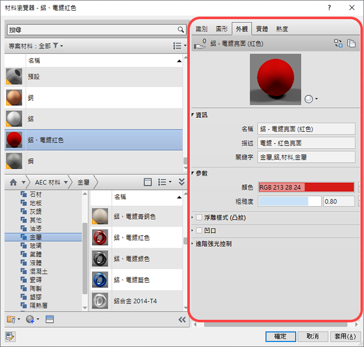 Revit LT 支援使用材料以定義專案視圖中的元素圖形和彩現影像中的擬真外觀,以及材料的一般資訊。