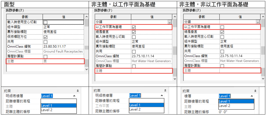 內容定義也會影響有哪個樓層相關性質可用。「以面為基礎」和「非主體,以工作平面為基礎」的元素有「明細表層次」性質值。「非主體,非以工作平面為基礎」的元素沒有「明細表層次」性質。但是它們有「樓層」性質,如下表摘要: