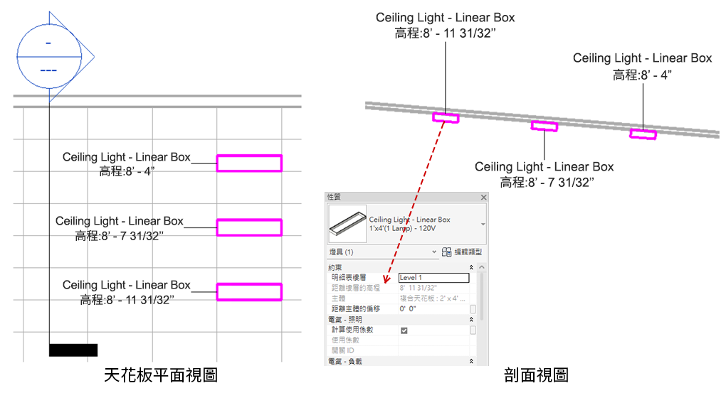 當元素放在非垂直表面上 (例如插座放在樓板上或燈具放在天花板上) 時,「距離樓層的高程」參數是不能編輯的。