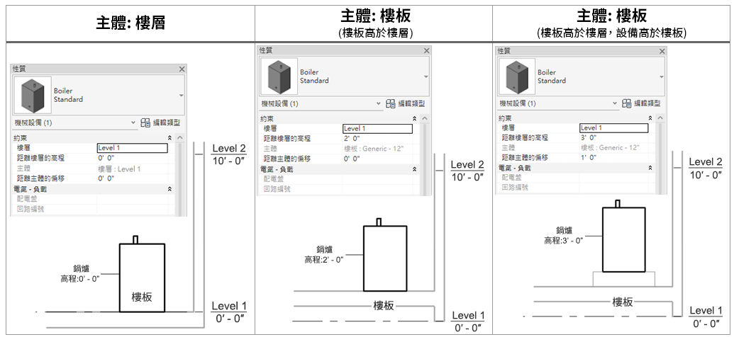 在以下範例中,樓板是在樓層上方 2' 0" 的位置。在樓板上放置鍋爐時,「距離樓層的高程」= 2' 0",「距離主體的偏移」= 0' 0"。